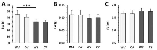 Male mice from the water group (W♂ mice) had increased BW compared to females (W♀ mice; Figure 1A). On the other hand, no significant differences in FW and FL were determined between sexes (W♂ and W♀ individuals; Figure 1B,C). Cola intake did not cause significant changes in BW, FW, FL between the W and C (cola) groups of either sex (Figure 1A–C), potentially due to reduced food intake when drinking cola.