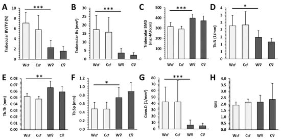 Micro-CT trabecular parameters in male (♂) and female (♀) mice from water (W) and cola (C) groups. (A) Volume fraction (bone volume/total volume; BV/TV), (B) bone surface (Bs), (C) bone mineral density (BMD), (D) trabecular number (Tb.N), (E) trabecular thickness (Tb.Th), (F) trabecular separation (Tb.Sp), (G) connectivity density (Conn.D), (H) structure model index (SMI). The values are represented as mean ± SD. Only differences between groups W♂ and W♀ as well as W and C of the same sex are indicated (* p < 0.05, ** p < 0.01, *** p < 0.001).