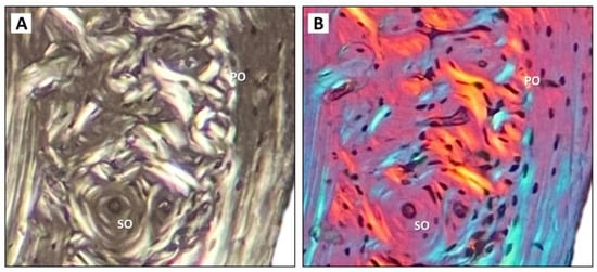 Histological images showing the pattern of collagen fibers determined using polarized light microscopy (A) and with the addition of λ plate compensator (B). Primary osteon (PO), secondary osteon (SO) (magnification ×400).