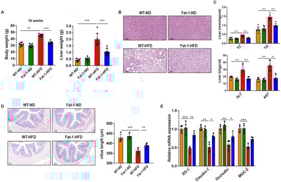 Endogenous n-3 PUFAs improve HFD-induced intestinal barrier dysfunction and hepatic steatosis. (A) Final body weight and liver weight at 16 weeks. (B) Liver pathology of different groups (200× magnification; scale bar = 50 μm). (C) Hepatic TC, TG, ALT, and AST content. (D) Representative images of H&E-stained colon sections (100× magnification; scale bar = 100 μm). Villus length quantified using ImageJ software (right). (E) qPCR analysis of genes involved in the intestinal barrier function. Results are presented as mean ± SD (n = 8 for each group). * p < 0.05, ** p < 0.01, and *** p < 0.001 by one-way ANOVA and Student’s t-test.