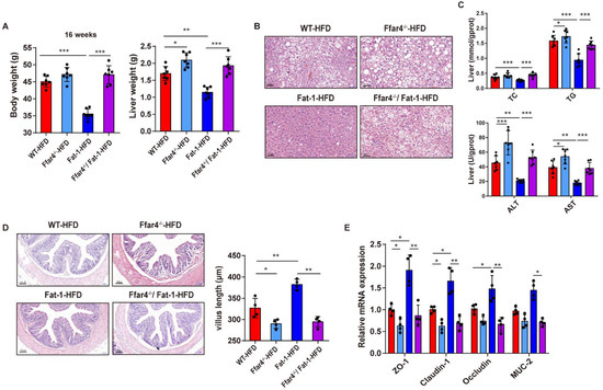FFAR4−/−/Fat-1 mice fed with a high-fat diet were used to further explore whether FFAR4 was involved in the improvement of gut and liver functions under NAFLD by endogenous n-3 PUFAs. FFAR4 deficiency blocked the beneficial effect of endogenous n-3 PUFAs on body weight, organ weight (liver and adipose tissue), and glucose metabolism (Figure 2A, Figure S1F, and Figure S2B). In addition, H&E section staining and determination of liver biochemical indicators were used to evaluate the effect of FFAR4 deficiency on liver pathology. FFAR4 deficiency suppressed the beneficial effects of endogenous fatty acids on liver pathology, as demonstrated by the aggravated hepatic fat vacuoles and the increased liver lipids (TC and TG) and injury markers (ALT and AST) as shown in Figure 2B,C. Furthermore, FFAR4 deficiency attenuated the improvement of endogenous n-3 PUFAs on the function of the intestinal barrier as determined by measuring the length of colonic villi and detecting the expression levels of intestinal barrier function genes by qPCR (Figure 2D,E). In summary, these results suggested that the improvement of gut and liver functions mediated by endogenous n-3 PUFAs required the participation of FFAR4.