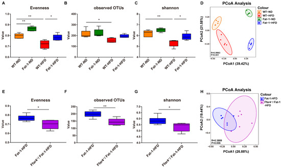 Diversity analysis of gut microbiota among different groups. Alpha diversity of the gut microbiome shown as evenness (A), observed OTUs (B), and Shannon index (C) among the WT-ND, Fat-1-ND, WT-HFD, and Fat-1-HFD groups. (D) PCoa plot of beta diversity in four groups (WT-ND, Fat-1-ND, WT-HFD, and Fat-1-HFD group). Alpha diversity of gut microbiome shown as evenness (E), observed OTUs (F), and Shannon index (G) between the Fat-1-HFD and FFAR4−/−/Fat-1-HFD groups. (H) PCoa of beta diversity in two groups (Fat-1-HFD and FFAR4−/−/Fat-1-HFD). Results are shown as mean ± SD (n = 5–6 for each group). * p < 0.05, ** p < 0.01.