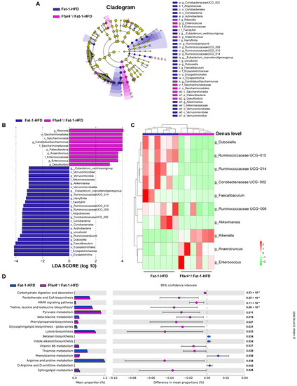 LEfSe analysis was conducted to identify the intestinal microbial biomarkers affected by FFAR4 deficiency (Figure 4A). Eighteen genera were identified as microbial biomarkers between the Fat-1-HFD and FFAR4−/−/Fat-1-HFD mice, as shown in Figure 4B. Moreover, the heatmap analysis revealed the top 10 significantly changed genera between the two groups (p < 0.05, Figure 4C). The FFAR4−/−/Fat-1-HFD group had an evident lower abundance of Dubosiella, Ruminococcaceae UCG-010, Ruminococcaceae UCG-014, Coriobacteriaceae UCG-002, Faecalibaculum, Ruminococcaceae UCG-009, and Akkermansia and a higher abundance of Rikenella, Anaerotruncus, and Enterococcus than that of the Fat-1-HFD group. Furthermore, a PICRUSt prediction analysis was performed to investigate the effect of FFAR4 deficiency on the metagenomic function of the gut microbiota following endogenous n-3 PUFAs enrichment. The 17 remarkably different pathways were identified between the two groups (p < 0.001–0.05, Figure 4D). Carbohydrate digestion and absorption, pantothenate and CoA biosynthesis, and the MAPK signaling pathway as well as valine, leucine, and leucine biosynthesis were significantly upregulated due to FFAR4 deficiency (p < 0.001). Therefore, these results indicated that FFAR4 deficiency altered the gut microbiota composition and microbial function pathway after endogenous n-3 PUFAs increase.