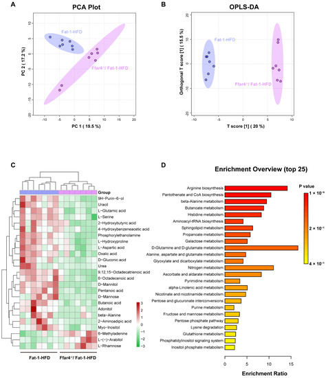 Am untargeted metabolomic analysis was conducted to further analyze the role of FFAR4 deficiency on liver metabolites in Fat-1 transgenic mice. The overall metabolite differences between the two groups were discriminated using PCA and OPLS-DA model analyses. The results demonstrated a significant difference in the distribution of metabolites between the Fat-1-HFD and FFAR4−/−/Fat-1 groups (Figure 5A,B). Moreover, 25 significantly different metabolites were found (VIP > 1, p < 0.05, Figure 5C). Next, metabolic pathway enrichment analysis was performed on the differential metabolites between the two groups to identify significantly altered metabolic pathways affected by FFAR4 deficiency. The overview of enrichment metabolic pathway analysis indicated that the metabolites significantly changed due to FFAR4 deficiency were involved in the 25 metabolic pathways (p < 0.05), with arginine biosynthesis being the most significantly changed pathway (Figure 5D). In all, these results suggest that FFAR4 deficiency altered liver metabolites and metabolic pathways in Fat-1 mice.