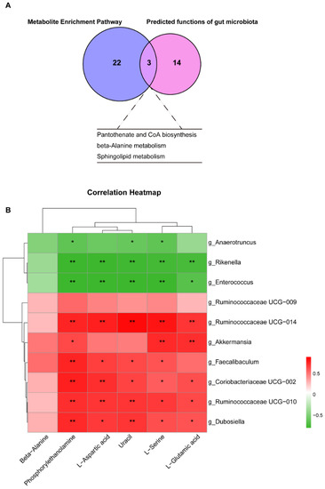A Venn plot intersection analysis was performed to identify common pathways between liver metabolite-increased pathways and predicted gut microbial functional pathways (Figure 6A). Pantothenate and CoA biosynthesis, beta-alanine metabolism, and sphingolipid metabolism were the most common differential metabolic pathways in the liver and gut. Additionally, we performed a correlation analysis to investigate the relationship between gut microbial biomarkers and liver differential metabolites belonging to three metabolic pathways. As shown in Figure 6B, the relative abundance of Dubosiella, Ruminococcaceae UCG-010, Ruminococcaceae UCG-014, Coriobacteriaceae UCG-002, Faecalibaculum, Ruminococcaceae UCG-009, and Akkermansia was positively associated with beta-alanine, phosohorylethanolamine, L-aspartic acid, uracil, L-serine, and L-glutamic acid content in the liver. However, the relative abundance of Rikenella, Anaerotruncus, and Enterococcus was negatively associated with the content of the above hepatic metabolites.