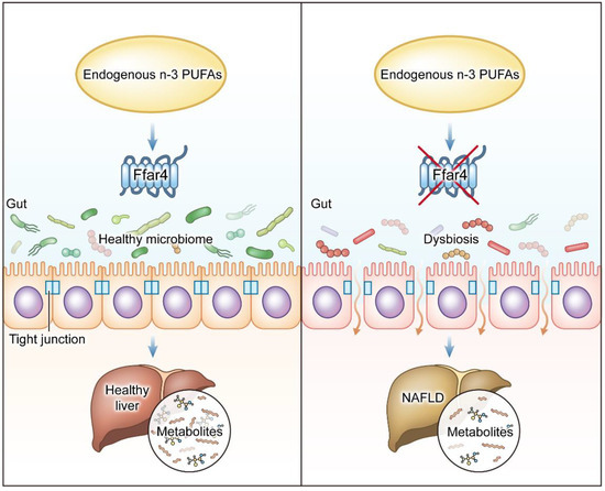 The increasing prevalence and global health burden of NAFLD have led to focused research and increased interest in the treatment of patients with NAFLD. Although many pathophysiological mechanisms and genetic variants of NAFLD have been identified, there are still no very effective drugs approved for the treatment of NAFLD. New drugs targeting the gut–liver axis have great potential in the treatment of NAFLD. Our results demonstrate that FFAR4 played an indispensable role in regulating the endogenous n-3 PUFA-mediated gut–liver axis to improve NAFLD (Figure 7).