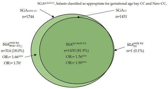 Classification of newborns by birth weight according to the use of conventional customized curves (CCs) and new CCs (new CCs). SGACC or SGANEW CC, small for gestational age according to the use of conventional curves (CCs) or new, customized curves (new CCs), respectively). : Infants classified as SGA according to the CCs and as AGA according to the new CCs. : Infants classified as SGA according to the new CCs and AGA according to the CCs. OR1: Odds ratio of , , and versus for the composite outcome 1 (cesarean section, Apgar < 7 at 1st min, Apgar < 7 at 5th min, NICU admission or mortality). OR2: Odds ratio of , , and versus for composite outcome 2 (Apgar < 7 at 1st min, Apgar < 7 at 5th min, NICU admission or mortality).* p value < 0.05 and *** p value < 0.001.