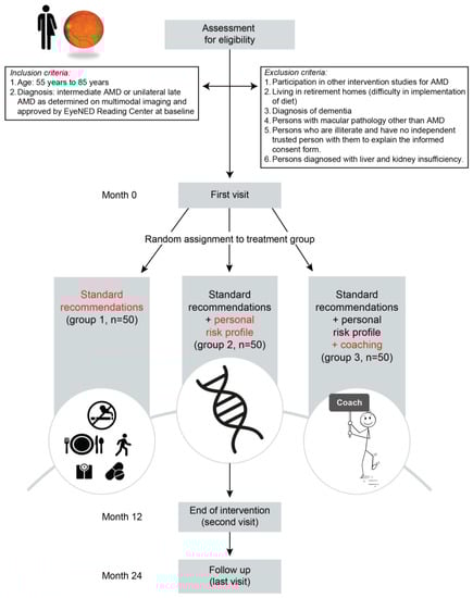 Age-related macular degeneration (AMD) has a strong genetic basis, but environmental factors such as smoking and a healthy diet can decrease the genetic fate by up to 50%. Current guidelines for clinical management include recommendations for a healthy lifestyle and antioxidant supplementation. However, many ophthalmologists do not inform their patients of this AMD-beneficial lifestyle. An important reason is the lack of trust that transition of lifestyle will be feasible in persons of advanced age and lack of methodology to measure lifestyle or its biological effects. To address these issues, we set up the lifestyle intervention study AMD-Life. It aims to investigate whether personalized risk-profiling (including genetic testing) and/or additional coaching can motivate patients to change their lifestyle. It also explores which biomarkers best reflect lifestyle change beneficial for AMD. The first year is a three-arm, self-contained open-label randomized clinical trial. A total of 150 AMD patients aged 55–85 years were randomized into three arms: (A) merely standard recommendations; (B) A conditions plus personalized risk profiling based on genetics and lifestyle, (C) B conditions plus coaching. The second year tests sustainability of lifestyle changes without active intervention. AMD-Life can provide further insight into the relevance of these interventions for the clinical management of AMD.