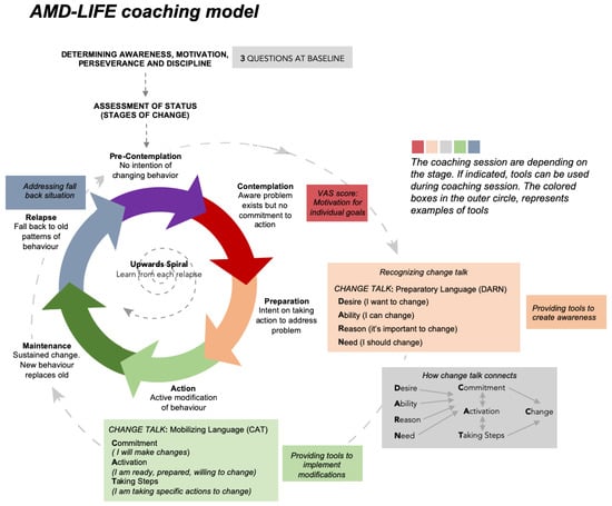 AMD-Life coaching model. The AMD-Life coaching model reflects an upwards spiral to learn from each relapse. Included in the model are: ‘the 3 questions’ at baseline to determine awareness, motivation, perseverance and discipline, and goal-setting; a model for Behavioral Change Technique (BCT), the transtheoretical model of change (determining of ambivalence/assessment of status), adapted with permission from Prochaska and DiClemente [,]; and a model for motivational interviewing (MI), increasing/recognizing of ‘change talk’ through DARN-CAT, adapted with permission from Miller and Rollnick []. Depending on the stage and/or need of the participant, several tools, information leaflets, documents with assignments, and tables (e.g., specific foods and levels/concentrations of beneficial AMD-nutrients) can be used and/or provided to enhance awareness and stimulate habitual change.