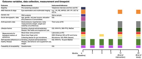 Data collection in AMD-Life. All study participants have the same measurements, irrespective of the study arm. Abbreviations: RC, research center; AMD, age-related macular degeneration; VA, best-corrected visual acuity; RE, refractive error; MPOD, Macular Pigment Optical Density; IOP, intra-ocular pressure; FP, fundus photography; OCT, optical coherence tomography; OQ, online questionnaire; WHI-FA, Women’s Health Initiative Physical Activity Questionnaire; 389-FFQ, food frequency questionnaire; MeDiet, Mediterranean Diet Score; BMI, body mass index; DBS, dried blood spot.
