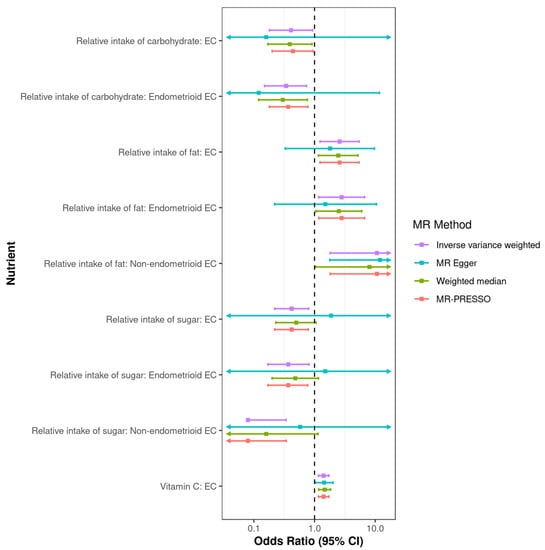 The aim of this study was to use MR analysis to investigate the relationship between essential dietary factors and endometrial cancer risk using genetically predicted relative macronutrient intake (fat, protein, sugar and carbohydrate)and genetically predicted circulating concentrations of 15 micronutrients (vitamins and minerals). Micronutrients selected are essential for biological processes related to cancer. Many have been previously assessed for association with endometrial cancer with inconsistent results reported [,].