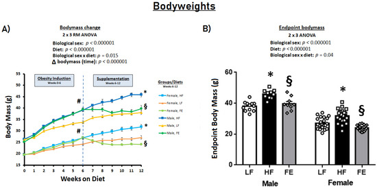 | Fat mass (g) | 11.8 ± 1.0 | 23.0 ± 0.7 * | 17.0 ± 1.7 § | 5.0 ± 1.3 | 13.2 ± 1.7 * | 4.1 ± 1.1 § |