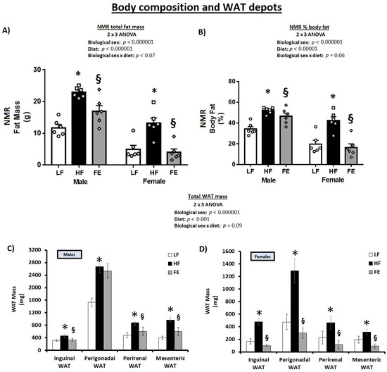 | Total WAT (mg) | 3367 ± 376 | 6223 ± 297 * | 5092 ± 560 § | 1335 ± 399 | 3186 ± 499 * | 762 ± 245 § |