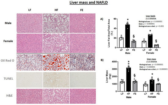 | Liver (mg) | 1328.9 ± 80.4 | 3176.4 ± 153.5 * | 1354.6 ± 83.2 § | 951.6 ± 89.0 | 1553.1 ± 124.2 * | 1014.4 ± 17.8 § |
