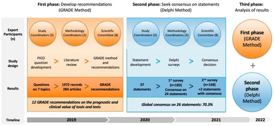 This study was developed and coordinated by several groups (study coordinators, methodology coordinators, and the scientific committee). PICO (Patient, Intervention, Comparison, Outcome) framework was used to develop clinical questions to guide the literature review, ultimately developing GRADE (Grading of Recommendations Assessment, Development and Evaluation) recommendations. A total of 37 statements were developed on 7 topics; these were evaluated in a Delphi method, achieving consensus on 26 statements.