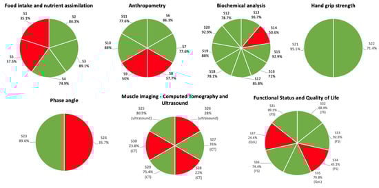 GRADE recommendations covered seven topics, and, with the Delphi method, a consensus was achieved on statements pertaining to each of these topics. The highest degree of consensus was achieved on the topics of HGS (2/2, 100%) (found useful and feasible), biochemical analysis (8/9, 88.8%) (found useful and feasible, except for the usefulness of one test), and functional status and QoL (5/7, 71.4%) (found useful, with lack of consensus concerning feasibility). A lower degree of consensus was achieved on anthropometry (4/6, 66.6%) (lack of consensus concerned only skinfold measurement, both its usefulness and feasibility), food intake and nutrient assimilation (3/5, 60%) (lack of consensus concerned usefulness in predicting prognosis in certain situations), phase angle (1/2, 50%) (found useful but not feasible), and muscle imaging (3/6, 50%) (found useful but not feasible).