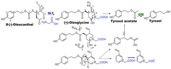 - Darakjian, L.I.; Rigakou, A.; Brannen, A.; Qusa, M.H.; Tasiakou, N.; Diamantakos, P.; Reed, M.N.; Panizzi, P.; Boersma, M.D.; Melliou, E.; et al. Spontaneous in vitro and in vivo interaction of (−)-oleocanthal with glycine in biological fluids: Novel pharmacokinetic markers. ACS Pharmacol. Transl. Sci. 2021, 4, 179–192. [Google Scholar] [CrossRef]
