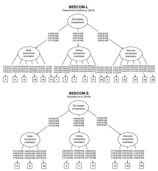 Findings from several research studies have been consistent in supporting the psychometric properties of the BEECOM scores in terms of both reliability and convergent/incremental validity [14,16,17,18]. In contrast, the available evidence on the factorial validity of the instrument is far less conclusive. For example, evidence has been provided that supports the original long 18-item structure consisting of 6 items each for the three lower-order factors (body-, eating-, and exercise-related comparison orientation) and a higher-order factor (ED-related comparison orientation) on a sample of non-clinical U.S. college females [17]. However, this factor structure is not supported by the results of two subsequent studies. Firstly, the one conducted in a non-clinical sample of Iranian university male and female students with the aim of providing a Farsi translation of the original long version of the BEECOM (hereinafter BEECOM-L) revealed gender differences in the distribution of several items across the lower-order factors [18]. Secondly, the one conducted on a sample of U.S. females in their young adulthood revealed that several items did not load clearly on their theoretically relevant lower-order factors in the clinical subsample in terms of ED [16]. This finding led the authors to propose a short version of the instrument (BEECOM-S) consisting of 9 items (3 for each lower-order factor) instead of 18 items, whose adequate fit was subsequently corroborated in a second non-clinical subsample of otherwise similar socio-demographic characteristics to the first one [16].