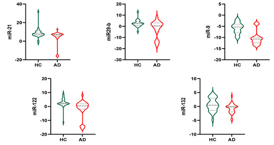 In all populations, no difference was found in examined exosomal miRNAs between genders (data not shown). Stratifying the sample population by groups of diagnosis among all examined exosomal miRNAs (let7f5p, miR-9, miR-15a, miR-21, miR29-b, miR-122, miR-132, miR29-a, miR-128, miR-491, miR-146, miR-34, miR-874), five of them showed a statistically significant difference between groups and are reported in Figure 2. Namely, compared to HC, subjects with AD had lower miR-21 (4.1 ± 7.4 vs. 8.3 ± 5.2 p = 0.011), miR29-b (−2.5 ± 7.2 vs. 2.6 ± 3.0 p < 0.001), miR-9 (−10.4 ± 3.07 vs. −5.7 ± 2.4 p < 0.0001), miR-122 (−1.8 ± 6.2 vs. 2.7 ± 3.3 p < 0.0001), miR-132 (−0.67 ± 1.6 vs. 0.63 ± 2.3 p = 0.014).