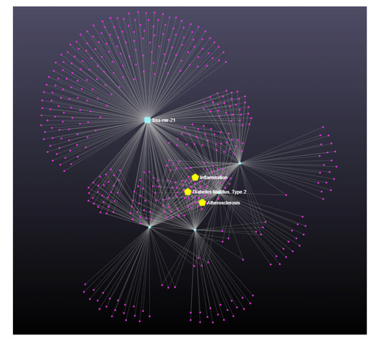 An analysis conducted with miRNet (a miRNA-centric network visual analytics platform) showed that all these miRNAs are interconnected and involved in inflammation, type 2 diabetes mellitus, and atherosclerosis (Figure 3).