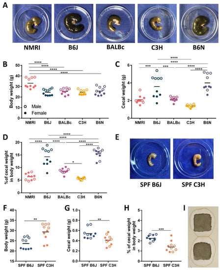 3.1. Cecal Enlargement Varies between Different Germ-Free Strains