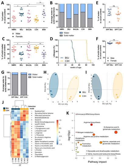 3.2. Host Genetic Background Shapes Distinct Metabolic Profiles in The Gf Mice Cecum