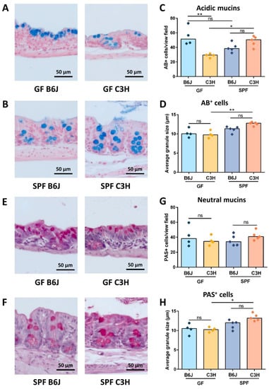 3.4. GF B6J Display Increased Production of Acidic Mucins in the Gut