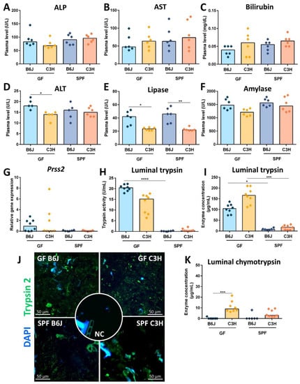 3.5. Reduced Cecal Size in Gf C3h Mice Is Independent of Increased Digestive Enzyme Levels