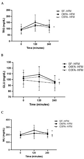 (A–C). Postprandial metabolic responses. Metabolic responses in the three smoothie conditions are displayed as a mean ± SE for baseline, 2 h (120 min), and 4 h (240 min). TRGs (A), GLU (B), and MLI (C) are displayed with the SF-HFM in shaded black circle, the O6FA-HFM in black squares, and the O3FA-HFM in black triangles. * Indicates significance across time points, and † indicates significance as an interaction between smoothie type and time point.