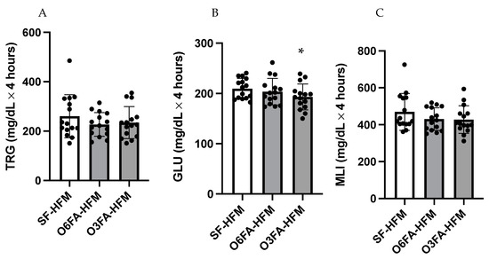 Statistical analysis was performed using GraphPad Prism. Sample size calculation was performed a priori based on our previous research using significant differences in triglycerides and airway inflammation. With a power of 0.80 and a two-sided alpha of 0.05, 12 subjects were required to complete all three conditions to observe differences in airway inflammation (data under review and not included in the present study). After collection, data were analyzed for normality, and all data were normally distributed. A three-way repeated measured analysis of variance (RM-ANOVA) was run with the time (baseline, 2 h, and 4 h) as the within-subjects effect and the fatty acid smoothie condition (SF, O3FAs, and O6FAs) as the between-subjects effect. Total AUC for TRGs, GLU, and MLI were also calculated. Tukey’s multiple comparison tests were run to assess pairwise comparisons between time points and conditions. Significance was set to p < 0.05 for all analyses.