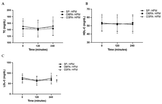 (A–C). Postprandial metabolic responses. Metabolic responses in the three smoothie conditions are displayed as a mean ± SE for baseline, 2 h (120 min), and 4 h (240 min). TC (A), HDL-C (B), and LDL-C (C) are displayed with the SF-HFM in shaded black circle, the O6FA-HFM in black squares, and the O3FA-HFM in black triangles. * Indicates significance across time points, and † indicates significance as an interaction between smoothie type and time point.