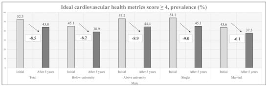 Given that a large proportion of participants had more than a university education, they had a greater effect on the results of the five-year follow-up than participants with less than a university education, so their results were similar to those of all participants. Our study showed that ideal CVH scores were higher among the more educated participants than among their less educated counterparts. Inverse associations between low education levels and ideal CVH scores were also described in the National Health and Nutrition Examination Survey (NHANES) [48]. Moreover, in developing countries, college-educated participants had higher ideal CVH scores than participants with less than a high school education [49]. Additionally, our study revealed that education is a key factor that leads to a healthier lifestyle and that it has a greater impact on females than it does on males. Because women have fewer socioeconomic resources, such as power, authority, and income, education may improve women’s health more than men’s health [50].