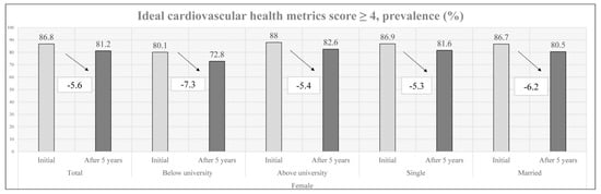 After 5 years of follow-up, the prevalence of CVH metrics shifted to nonideal, but CVH metrics (score: 4, 6, 7) among females with a higher than university education unexpectedly increased (Table 3). Regarding individual CVH metrics, ideal BMI, glucose, and cholesterol significantly decreased among males with less than a university education. On the other hand, among males with more than a university education, ideal PA, BMI, glucose, and cholesterol significantly decreased, but ideal diet and BP significantly increased. Moreover, among females with less than a university education, ideal BMI, glucose, and cholesterol significantly decreased similar to those of their male counterparts, but ideal PA significantly increased. Ideal BMI, glucose, and cholesterol significantly decreased, but ideal PA and diet significantly increased among females with more than a university education.