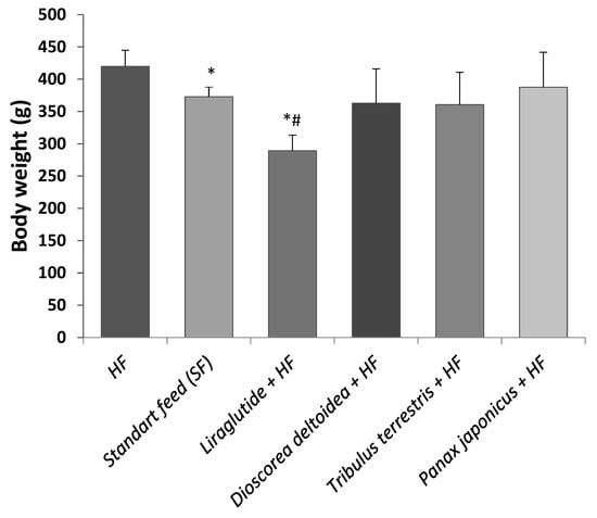 Body weight of the animals of intact (SF), control (HF), and experimental groups measured at the end of the experiment (3 months of obesity formation followed by 3 months of treatments). SF—standard feed, intact group; HF—hypercaloric feed. *—significantly different from the control (HF) group; #—significantly different from the intact (SF) group (*, #–0.01 < p < 0.05).