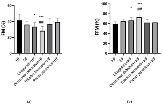 The FM and FFM of the animals treated with the cell biomass of P. japonicus and T. terrestris laid in between the control (HF) and intact (SF) groups, i.e., these preparations caused a slight decrease in the fat mass accumulation of the obese animals, but the differences from the control group without treatment were insignificant (Figure 2).
