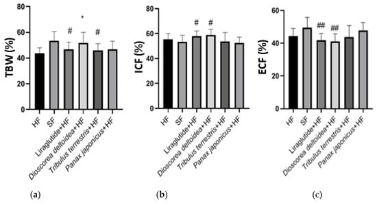 Total body water (TBW, (a)), intracellular fluid (ICF, (b)), and extracellular fluid (ECF, (c)) values in animals of intact, control, and experimental groups measured at the end of the experiment (3 months of obesity formation followed by 3 months of treatments). SF—standard feed, intact group; HF—hypercaloric feed. *—significantly different from the control (HF) group; #—significantly different from the intact (SF) group (*, #—0.01 < p < 0.05; ##—0.001 < p < 0.01).