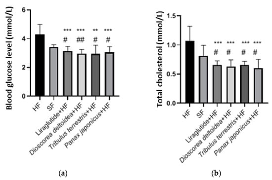 Blood glucose level (a) and total cholesterol in blood serum (b) in animals of intact, control, and experimental groups measured at the end of the experiment (3 months of obesity formation followed by 3 months of treatments). SF—standard feed, intact group; HF—hypercaloric feed. *—significantly different from the control (HF) group; #—significantly different from the intact (SF) group (#—0.01 < p < 0.05; **, ##—0.001 < p < 0.01; ***—p < 0.001).