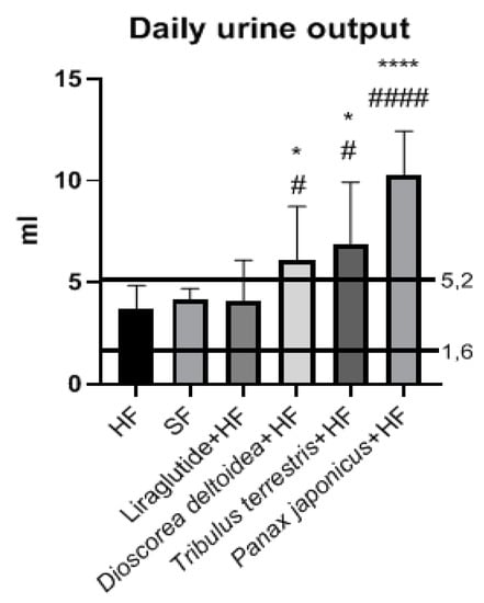 The daily urine output in the intact and HF groups recorded before drug administration (3 months after the beginning of different feeding) ranged from 1.6 mL to 5.2 mL (indicated in Figure 5 by two horizontal lines). At the end of the experiment (after 3 months of treatment), an increase in the daily urine output was observed in the animals that received the cell biomass of D. deltoidea, T. terrestris, and P. japonicus compared to the control, intact, and liraglutide-receiving groups (Figure 5). The daily urine output of the rats treated with the P. japonicus cell biomass was more than two times higher than in the intact group and added up to 10.3 ± 2.2 mL. In the groups treated with the D. deltoidea and T. terrestris cell biomass, the daily urine volume was nearly similar (6.8 ± 3.1 mL and 6.1 ± 2.7 mL, respectively). In the rats that were injected with liraglutide against the background of a hypercaloric diet, no statistically significant change in the daily urine output (4.1 ± 2.0 mL) in comparison with the control and intact groups was observed (Figure 5).