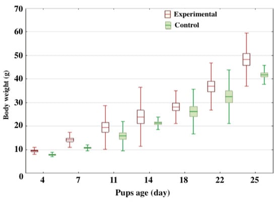 The dynamics of the rat pups’ body weight accumulation. Control—intact parents; Experimental—parents received the phytopreparation of Dioscorea deltoidea cells. Data are presented as box plots where the box illustrates the value range from the 25th to 75th percentiles with the median line in the middle, and the bars extend to the minimum and maximum values of the dataset.