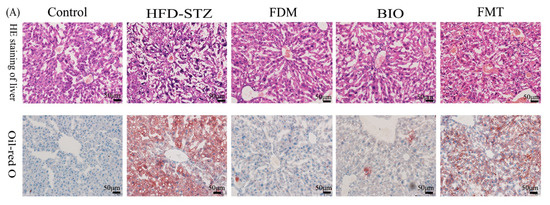 To study the effect of microbiota transplantation on lipid metabolism, the weight and diet of mice was monitored. The hyperglycemia after modeling caused the weight to drop sharply to 20.53 ± 0.79 g. At the end of the treatment, the FDM (18.94 ± 1.11 g, p < 0.001) and BIO (18.66 ± 0.4 g, p < 0.001) groups increased more than HFD-STZ (16.18 ± 1.04 g) (Figure 5A,B). The average amount of food consumption per 5 mice per week was determined by modeling (60.75 ± 4.92 g) and stabilized to a relatively constant level (78.56 ± 1.72 g, p < 0.001) at the 12th week (Figure 5C). As the colonic mucus layer and appetite loss of the T2D mice were restored to a certain extent after the microbiota transplantation, the weight of mice was maintained at a certain level in the later period and no longer decreased. Among them, the FDM group exhibited the greatest recovery, while the FMT group showed the least amount of recovery.
