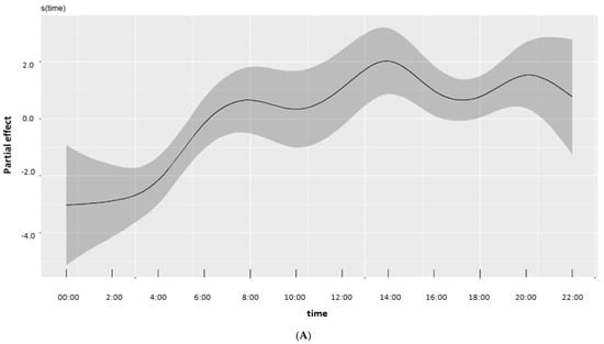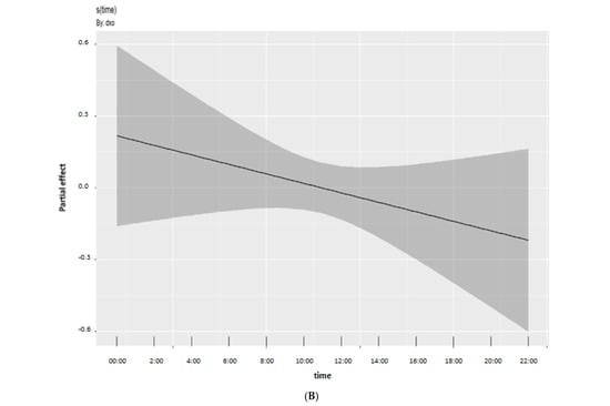 The basisdimension (k) was set to 12 to allow for maximal flexibility (“wiggliness”), since GAMs remove redundant degrees of freedom, thus protecting from overfitting, by applying a “wiggliness” penalty equal to: λ, where λ is known as the smoothing parameter that controls the tradeoff between model fit and model smoothness [34]. Restricted estimated maximum likelihood (REML) was used to estimate λ through a Bayesian approach, since it has demonstrated better overall performance and numerical stability compared to generalized cross validation (model default) [37,38].