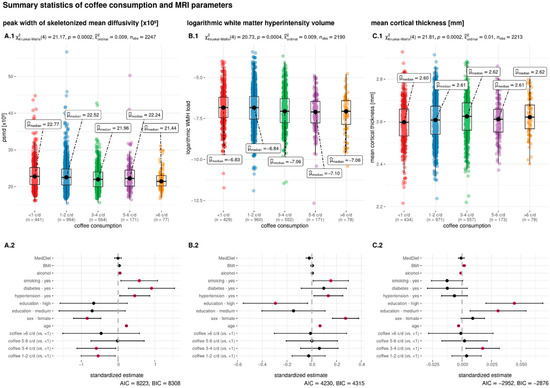 - Araújo, L.F.; Mirza, S.S.; Bos, D.; Niessen, W.J.; Barreto, S.M.; van der Lugt, A.; Vernooij, M.W.; Hofman, A.; Tiemeier, H.; Ikram, M.A. Association of Coffee Consumption with MRI Markers and Cognitive Function: A Population-Based Study. J. Alzheimer’s Dis. 2016, 53, 451–461. [Google Scholar] [CrossRef]