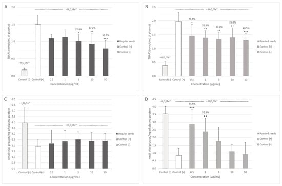 Effect of the extracts from regular (A,C) and roasted (B,D) sea buckthorn seeds on the level of thiobarbituric acid reactive substances (TBARS) and on the level of thiol groups in human plasma treated with Fe2+/H2O2 (n = 8). Control (+) and test samples (0.5–50 μg/mL) were incubated (30 min, 37 °C) with Fe2+/H2O2—an oxidative stress inducer. The results are presented as nmol TBARS/mL of plasma (A,B) and the results are also presented as nmol thiol groups/mg of plasma protein (C,D). The data are expressed as means ± SD. The results were considered significant at p < 0.05 (* p < 0.05; ** p < 0,01; *** p < 0.001). The numbers above significant results are % of lipid peroxidation inhibition.