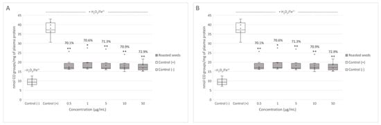 Effect of the extracts from regular (A) and roasted (B) sea buckthorn seeds (at concentrations 0.5–50 μg/mL) on the level of carbonyl (CO) groups in human plasma treated with Fe2+/H2O2 (n = 8). Control (+) and test samples (0.5–50 μg/mL) were incubated (30 min, 37 °C) with Fe2+/H2O2—an oxidative stress inducer. The results are presented as nmol CO groups/mg of plasma protein. The data are expressed as medians and interquartile ranges. The results were considered significant at p < 0.05 (* p < 0.05; ** p < 0,01). The numbers above significant results are % of carbonyl groups oxidation inhibition.