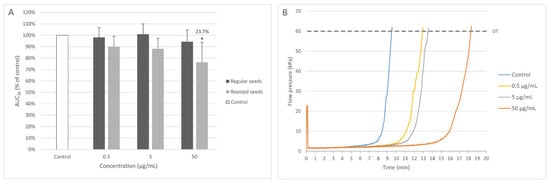 Effect of the extracts from regular and roasted sea buckthorn seeds (at concentrations 0.5, 5, and 50 μg/mL) on white thrombus formation in whole blood (n = 5). The samples were analyzed with T-TAS AR-chip, at the shear stress rates of 600/s. The results are presented as AUC30 (area under the curve). The data are expressed as means ± SD. The results were considered significant at p < 0.05 (* p < 0.05). The number above the significant result is % of coagulation inhibition. (A). Effect of the extract from roasted sea buckthorn seeds (at concentrations 0.5, 5, and 50 μg/mL) on coagulation in whole blood; OT—occlusion time (B). Figure 4B demonstrates selected diagrams (B).