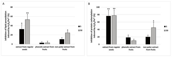 It was demonstrated that the extract from regular sea buckthorn seeds (1 and 50 µg/mL) had stronger antioxidant activity (measured by TBARS level (A) and protein carbonylation (B)) than the phenolic extract from sea buckthorn fruits (1 and 50 µg/mL) and the non-polar extract from sea buckthorn fruits (1 and 50 µg/mL) (Figure 5).