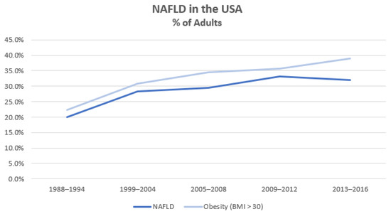 Proportion of U.S.A. adults with NAFLD and/or obesity (adapted from Younossi et al. [3]).