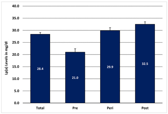Comparing lipoprotein(a) level in premenopausal, perimenopausal, and postmenopausal women. Note: Data are presented as the mean of lipoprotein(a) level in mg/dL in each group according to menopausal status. Abbreviations: Lp(a): lipoprotein(a); Total: Total sample; Pre: premenopausal women; Peri: perimenopausal women; Post: postmenopausal women.