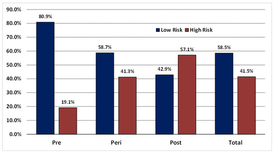 The distribution of low-risk and high-risk lipoprotein(a) levels among premenopausal, perimenopausal, and postmenopausal women; Lp(a) cut-off value is 30 mg/dL. Note: Data are presented as the percentage of low-risk Lp(a) level and high-risk Lp(a) level among menopausal groups. Lipoprotein(a) cut-off value is 30 mg/dL. The low-risk group’s Lp(a) concentration is below 30 mg/dL. The high-risk group’s Lp(a) concentration is above 30 mg/dL. Abbreviations: Pre: premenopausal women; Peri: perimenopausal women; Post: postmenopausal.