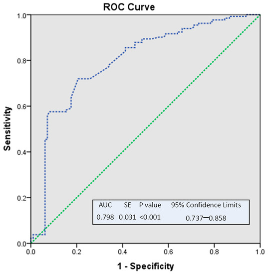 When categorizing Lp(a) level into four age groups, as shown in Figure 3, the magnitude of Lp(a) increased significantly after age 50 and was reported to be the highest in women above 60. In Figure 4, we dichotomized the age into two groups based on a cut-off of 50 years [7], as reported before. ROC analysis was performed to see the predictive value for Lp(a) levels. It revealed AUC 79.8%, p < 0.001. It showed that age significantly and strongly predicted elevated Lp(a) levels in women.